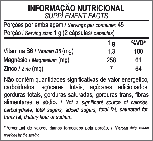 O ZMA da Max Titanium é composto por ZINCO, que auxilia no funcionamento do sistema imune e na síntese de proteínas, MAGNÉSIO, que auxilia no funcionamento muscular e VITAMINA B6, que auxilia no metabolismo energético.